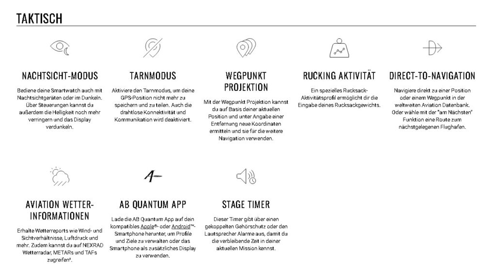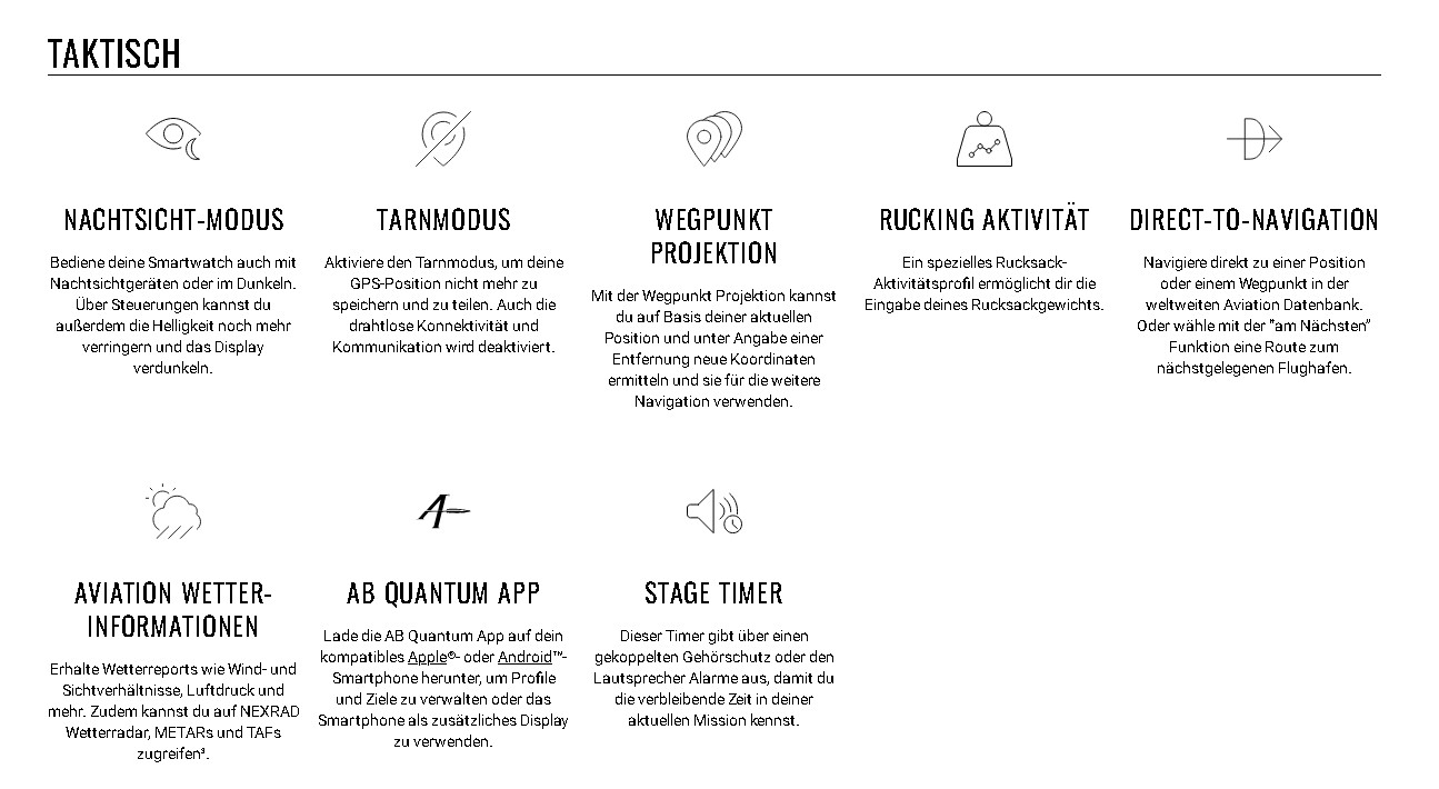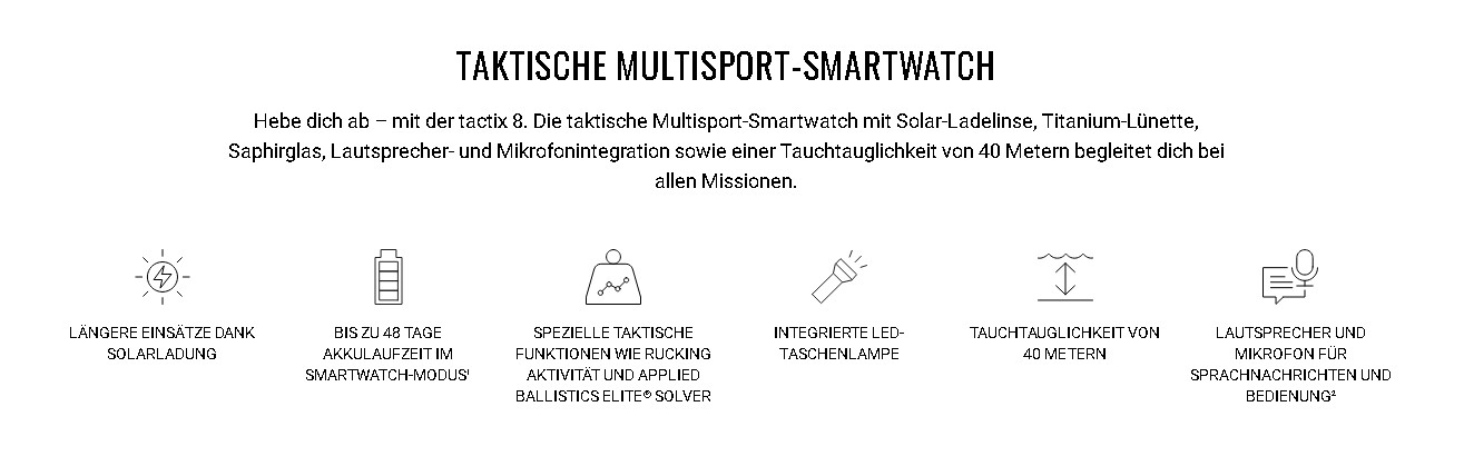 | Akkulaufzeit | Smartwatch: Bis zu 30 Tage/48 Tage mit Solarladung* Energiespar-Modus: Bis zu 48 Tage/107 Tage mit Solarladung* GPS-Modus: Bis zu 95 Stunden/149 Stunden mit Solarladung** Alle Satellitensysteme: Bis zu 68 Stunden/92 Stunden mit Solar** Alle Satellitensysteme + Multiband: Bis zu 52 Stunden/65 Stunden mit Solarladung*** Alle Satellitensysteme + Musik: Bis zu 18 Stunden Maximaler GPS-Modus: Bis zu 186 Stunden/653 Stunden mit Solarladung** Expeditions-GPS-Modus: Bis zu 50 Tage/118 Tage mit Solarladung* * Mit Solarladung; es wird von einer ganztägigen Tragezeit mit einem Aufenthalt von 3 Stunden im Freien bei 50.000 Lux ausgegangen. ** Mit Solarladung; es wird von einer durchgängigen Verwendung bei 50.000 Lux während des gesamten Zeitraums ausgegangen. *** Solarladung, Voraussetzung ist eine Verwendung bei 50.000 Lux; Voraussetzung ist ein normaler Gebrauch mit SatIQ-Technologie |